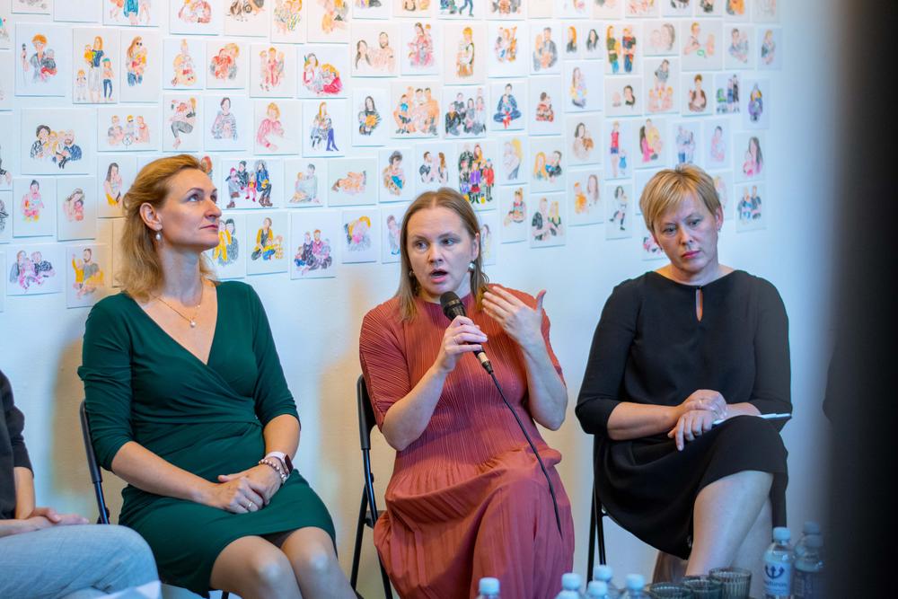 Biedrības organizētās izstādes laikā 9. septembrī galerijā "Istaba" notika diskusija par vardarbību dzemdībās, kuras mērķis bija identificēt cēloņus tam, kāpēc vardarbība dzemdībās Latvijas stacionāros joprojām ir plaši izplatīta parādība, kā arī veicināt izpratni par cieņpilnu attieksmi pret dzemdējošu sievieti un kopīgi meklēt risinājumu. Par medicīnas aprūpes personāla nodarītā kaitējuma izpausmēm, pacientes tiesībām, vardarbības cēloņiem un sekām, kā arī par to, kādi situācijas risināšanas un tiesiskās aizsardzības mehānismi šobrīd pieejami un kā novērst to nepilnības, diskutēja veselības ministrs Daniels Pavļuts, mājdzemdību vecmāte Dina Ceple, ginekoloģe, dzemdību speciāliste, Veselības centru apvienības Ginekoloģijas dienesta vadītāja, RSU pasniedzēja Karlīna Elksne, Latvijas Universitātes Medicīnas fakultātes asociētā profesore Signe Mežinska un klīniskā psiholoģe un pārraudze, kognitīvi biheiviorālās terapijas psihoterapeite un supervizore Marina Brice. Diskusiju vadīja publiciste Agra Lieģe-Doležko.