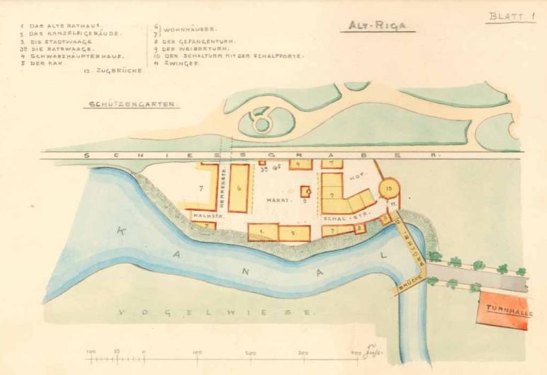 Liecības par svētku celtnēm un pasākumiem atrodamas Rīgas jubilejas izstādes iniciatora Makša Šervinska 1902. gadā izdotajā atmiņu kompilācijā, kas vienlaikus ir tehniskā raksturojuma izdevums un attēlu katalogs Rigaer Jubiläums Ausstellung in Bild und Wort jeb "Rīgas jubilejas izstāde vārdos un attēlos". Teksts kalpo arī kā pavadonis, ja vēlamies izstaigāt Seno Rīgu. Ieiet pilsētiņā varēja caur Šāļu vārtiem pie pilsētas kanāla, kas maketā spēlēja Daugavas lomu. Tie veda uz Šāļu ielu (reālajā Vecrīgas topogrāfijā – Svērtuves iela, kas šodien kļuvusi par daļu Kaļķu ielas), kuras galā pacēlās Rātsnams, tāds, kāds tas varētu būt izskatījies ap 1749. gadu. Turpat laukuma vidū bijusi sodu izpildes vieta jeb kāķis, aka un Rolanda statuja. Pretī Melngalvju nams, Arsenāls un Svaru māja. Rātslaukumu varēja pamest pa Kaļķu ielu, kuras galā atradās Kaļķu vārti un Kaļķu tornis. Neizejot pa vārtiem, bet griežoties uzreiz pa labi, varēja nokļūt Siļķu jeb tagadējā Kungu ielā. Tās galā bija redzams Sv. Jura tornis, kāda gan Rīgā nekad nav bijis, to projekta arhitekts Augusts Reinbergs pievienojis kompozīcijas pilnīguma dēļ. Atlikušie četri panorāmu veidojošie torņi bija savulaik reāli pastāvējušie Sievu, Gūstekņu, Kaļķu un Pēterbaznīcas torņi.