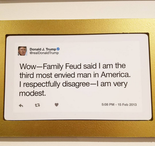 Vienā no telpām uz ekrāna redzams Trampa tvitera konts un katra jauna ieraksta parādīšanos pavada sirēnu skaņas. Turpat atrodas arī monitors, kas fiksē Trampa tvītošanas paradumus, piemēram, skaita, cik reizes ASV prezidents savos ierakstos piemin dažādus ģimenes locekļus (meita Ivanka sasniegusi jau vairāk nekā 500 reižu, savukārt meita Tifānija – tikai septiņas) un uzbrūk politiskajiem pretiniekiem (ASV bijušais prezidents Baraks Obama Trampa tvītos pieminēts vairāk nekā 2700 reižu).