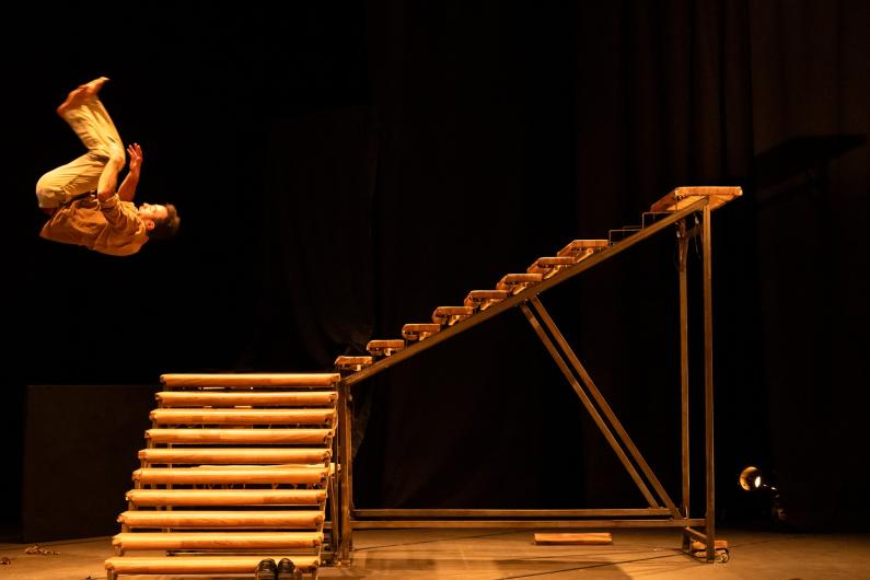 Ir tādas cirka izrādes, pēc kurām tu iznāc no zāles un sāc uz priekšmetiem skatīties pavisam citādi. Durvis vairs nav durvis – tās ir smagas metaforas, kuras tevi spēj piespiest pie cirka grīdas. Kāpnes vairs nav tikai kāpnes – tā ir eksistenciāla panika, kas sākas uz piektā pakāpiena, kad neesi pārliecināts, vai gribi kāpt augšup vai ripot atpakaļ lejā. Akrobāts Manels Ruzess Mureto nevis vienkārši lec, rāpjas un atkal krīt, bet ar absurdu precizitāti liek mums apšaubīt zemes pievilkšanas spēku un arī mūsu attiecības ar pārmaiņām. Viņš citē arī citas, laikmetīgajā cirkā populārākās kāpnes, uz kurām muzejos un bankās ar elegantu, sapņainu vieglumu lido un krīt Joans Buržuā. Manels par to izrādē pajoko kā par nozagtu ideju, kas ir viegli nolasāma.