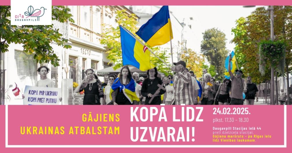24. februāra Ukrainas atbalsta gājiens "Kopā līdz uzvarai!" sāksies plkst. 17.30 pie Daugavpils dzelzceļa stacijas. Maršruts – pa Rīgas ielu līdz Vienības laukumam. Lai sagatavotos gājienam, interesenti ir aicināti no plkst. 14.00 līdz 17.00 apmeklēt plakātu darbnīcu kultūras institūta "New East" telpās.