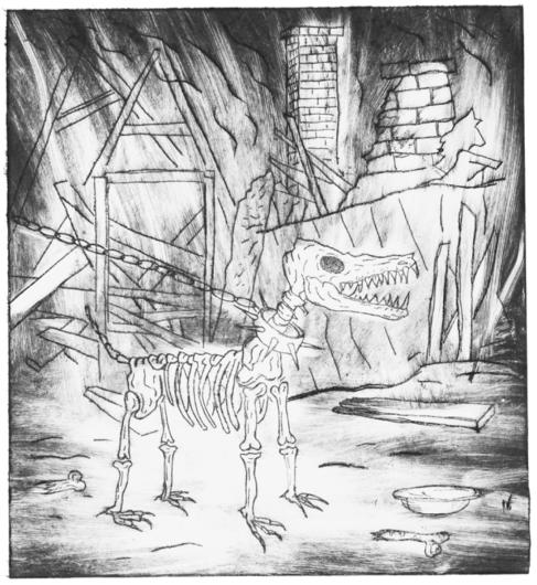 Cilvēka skeletam priekšā ir šķīvis ar vistas skeletu, bet zem galda tup suņa skelets. Un tieši pēdējais viņu tolaik biedēja visvairāk, jo apmēram tajos pašos gados viņš reiz bija skatījies, kā tiek nojaukti kādi veci malkas šķūņi – un tur vienā ilgus gadus nelietotā šķūnī aiz dažādām drazām atklājās kaķa skelets. Ūdens un sniegs, tekot cauri jumtam, dzīvnieka kaulus bija attīrījis no visa liekā, un tie nu spožajā pavasara saulē dzelteni vizēja, īpaši izceļot galvaskausa viepli, kas ar pavērtu muti un atņirgtiem zobiem raudzījās viņam tieši pretī. Tieši tāpat kā tagad nodegusī māja.