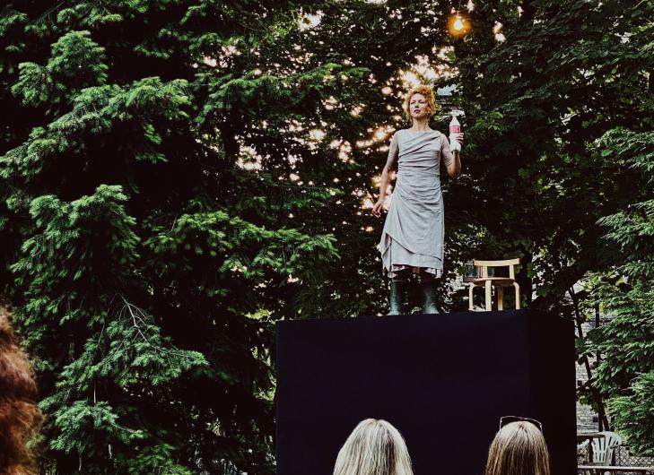 Grūti iztēloties, kāda būtu iespaidu buķete, ja izrāde tiktu spēlēta iekštelpās, kā sākotnēji bija paredzēts, jo ārā ir bezgala daudz ar jutekļiem un maņām uztveramu blakus impulsu, kas liek raisīties ar izrādi nesaistītām asociācijām. Kad aktrise uzkāpj uz melnā podesta starp divām varenām eglēm, viņas koku ieskautā figūra uz paaugstinājuma negaidīti atsauc prātā padomju laika pionieru vasaras nometnes, kuru teritorijā apstādījumos obligāti atradās kāda bronzas vai sudraba krāsā nokrāsota ģipša taurētāja vai bundzinieka skulptūra. Tomēr nē – aktrisei rokā nav ne taures, ne bungu, bet gan jogurta pudele, no kuras viņa pāris reizes garšīgi iemalko. Tas liek atgriezties realitātē. Dievs ar pionieru nometni – šo rindu autores bērnības traumu!