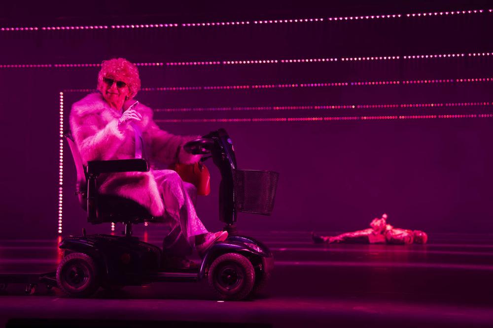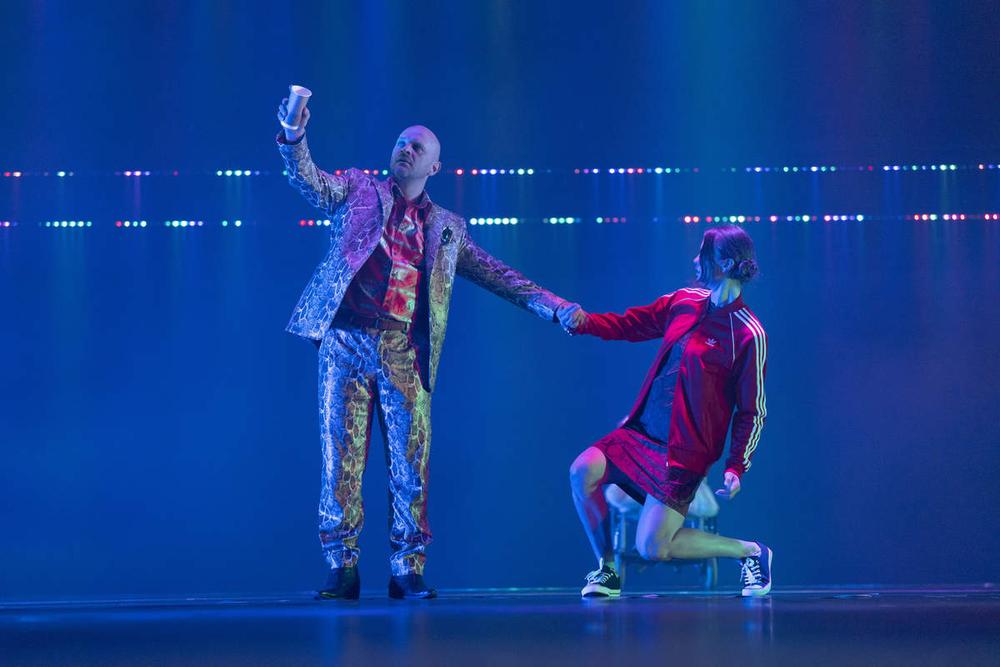 Ildiko Gāšpāra ar asistentu Ingas Krasovskas un Kintijas Rodžersas, kā arī ar dramaturga Matīsa Gricmaņa līdzdalību darbību pārcēlusi uz 21. gadsimtu un par notikuma vietu trāpīgi izvēlējusies spēļu zāli, kurai scenogrāfe Lili Ižāka, videotēlu autors Andrāšs Juhāss un gaismu mākslinieks Oskars Pauliņš ar asistentu Juriju Fjodorovu piešķīruši ne tikai šķietami viegli transformējamu veidolu, bet arī visplašāko emocionālās noskaņas spektru – no lētas izklaides vietas ar vienmuļi zibinošām, krāsainām gaismiņām līdz zvaigžņotam debesjumam nakts tumsā. No pieticīgi iekārtotas fotogrāfa darbnīcas līdz bāli pelēkrožainam ziedošu akāciju smaržas piepildītam horizontam. Telpa šķiet veramies vaļā un kļūstam arvien plašāka vai noslēpumaini satumst, gluži kā vēstījot par noziedzīgiem nodomiem un kādas kriminālas pasaules klātbūtni. Ģeometriskais minimālisms un krāsu plūstošā mainība fona prospektā attāli atgādina Roberta Vilsona izrāžu estētiku.