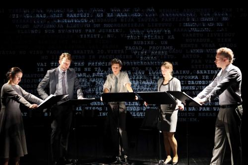 Savu versiju par slavenās Saeimas sēdes dienu rāda Andrejs Jarovojs un radošais aktieru kolektīvs – Ansis Bētiņš, Artūrs Čukurs, Elizabete Skrastiņa, Jana Ļisova un Mārtiņš Upenieks. Aktieru darbs izrādē ir pārsteidzošs, bet ne tā, kā Slaktera uzstāšanās "Bloomberg". Pārsteidzošs labā nozīmē. Ikviens puslīdz aktīvs teātra skatītājs ir dzirdējis baumas par to, cik talantīga aktrise ir Jana Ļisova, un arī šajā izrādē par to ir iespēja atkal pārliecināties. Šo aktrisi raksturo ļoti spēcīga, magnētiska enerģija, kas reizēm liek apbrīnā noelsties, jo no malas šķiet, ka Ļisovai šī atdeve neprasa nekādas grūtības. Viņa prot ar skatienu vien paņemt visu telpu un tādējādi sev pievērst arī visu skatītāju acis. Ne mazāku sajūsmu šajā iestudējumā sagādā arī pārējie aktieri, to skaitā Mārtiņš Upenieks, kurš izrādē demonstrē brīžiem neticamu runas virtuozitāti, un arī Elizabete Skrastiņa, kas parāda ne tikai cienījamas aktiermeistarības prasmes, bet arī perfektu ritma un mūzikas izjūtu. Cita starpā gan Skrastiņai, gan arī aktieriem Artūram Čukuram un Ansim Bētiņam ļoti spēcīga ir tieši muzikalitāte, jo visi šie mākslinieki katrs savā žanrā profesionāli darbojas arī kā mūziķi.