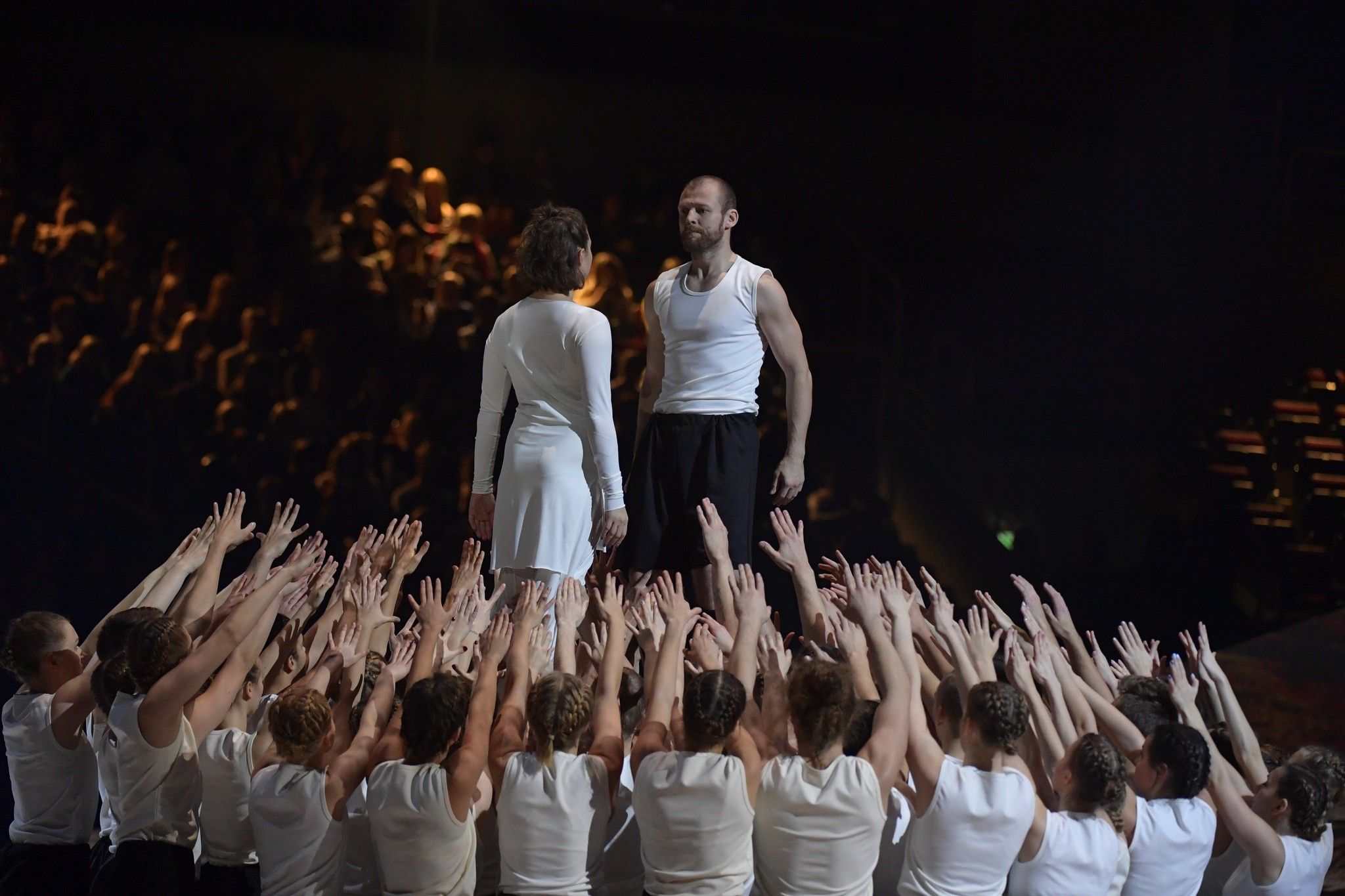 Par spīti tam, ka grupai uzstāšanās laikā bija jārēķinās ar dejotājiem un improvizācijas vai atkāpes no programmas veikt nevarēja, "Skyforger" nospēlēja labi, tomēr žēl, ka tautas instrumenti netika spēlēti dzīvajā izpildījumā. Prasmīgi veidotā scenogrāfija – trīs līmeņos būvētā skatuve, ko it kā caurvij koks, – vienā telpā ļāva ietvert visas sižeta darbības vietas, kā arī savienot laikmetīgu formu un folklorā būtiskus simbolus, tomēr jāatzīst, ka brīžos, kad dejotāji veica kustības guļus stāvoklī, tos saskatīt bija grūti. Kā īpaši spoža jāatzīmē kalvē notiekošā aina dziesmas "Velnukāvējs" laikā. Visticamāk, lielākā daļa dejotāju līdz tam nebija veikuši tāda līmeņa trikus ar uguni, tāpēc gluži vai apbrīnojami, cik tas viss izskatījās krāšņi. Skatītājiem tika piedāvāts arī videomateriāls, kas, kaut gan lakonisks, lieliski noderēja, lai izstāstītu stāstu, savukārt vēl vieglākai sižeta uztveršanai uz skatuves bija arī teicēja – aktrise Zane Jančevska. Ja visi iepriekš minētie elementi veidoja harmoniju un sajūtu, ka uzburtajā ainā varētu iegrimt, tad teicēja iestudējumam piešķīra pārlieku patosu, turklāt, jaucot tekstu, atveda atpakaļ koncerta realitātē. Bez teicējas tēla, manuprāt, varēja iztikt, tomēr, ņemot vērā auditorijas dažādību, iespējams, daļai noderēja ne tikai izdejots, izdziedāts, izspēlēts un attēlots, bet arī izrunāts stāsts.