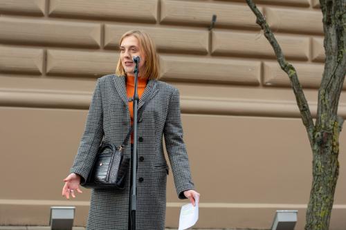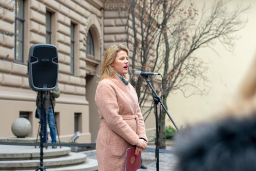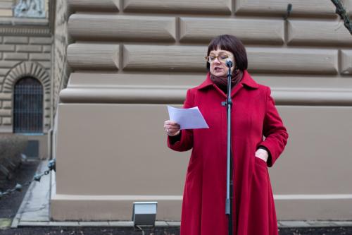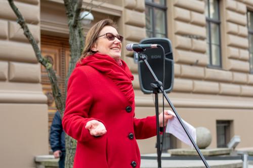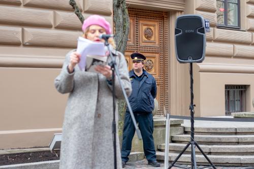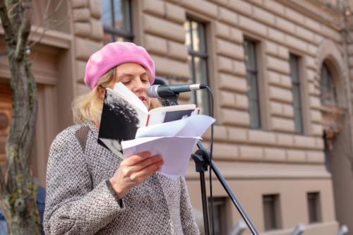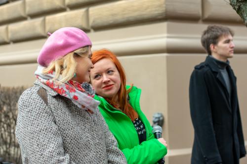 Gājiens sākās pie Saeimas ēkas, kur sanākušos uzrunāja resursu centra sievietēm "Marta" vadītāja Iluta Lāce, publiciste Linda Curika, kā arī dzejniece un Latvijas PEN vadītāja Inga Gaile, kura savā uzrunā uzsvēra, ka dzimumu līdztiesība nav tikai sieviešu nepieciešamība: "No tā, ka sabiedrībā tiek veicināta dzimumu līdzvērtība, ieguvēji ir visi, neatkarīgi no dzimuma, nacionalitātes, ādas krāsas vai seksuālās orientācijas. Cilvēks, kurš zina, ka viņš vai viņa ir vērtība, neatkarīgi no tā, vai viņš atbilst stereotipiskām dzimuma lomām vai ne, tāds cilvēks ir spējīgs uz empātiju pret sevi un apkārtējiem, tāds cilvēks ir spējīgs gan radīt atbilstoši savai būtībai, gan dalīties radītajā ar apkārtējiem."