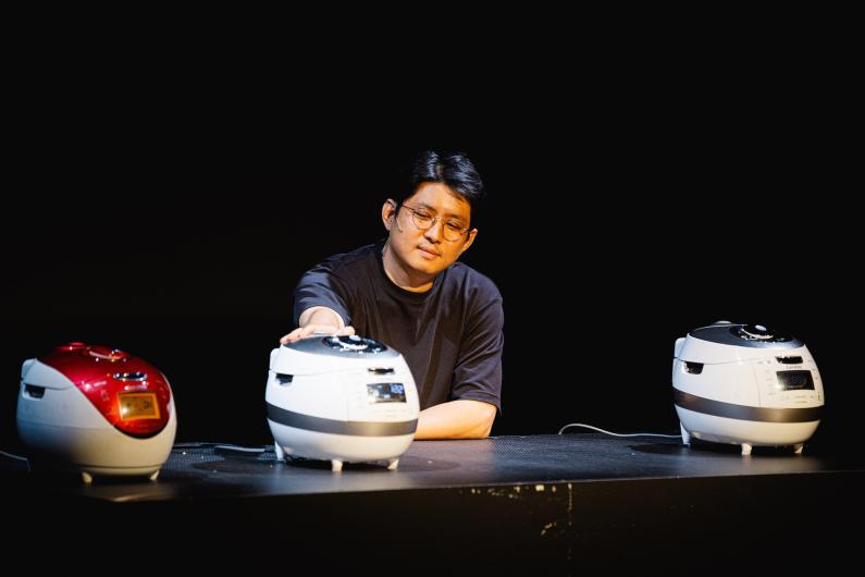 Askētiskā, melnā telpā Dienvidkorejas mākslinieks Džaha Kū (Jaha Koo) pavada laiku kopā ar pļāpīgiem rīsu vārāmajiem katliem, šķetinot sarežģītās pagātnes un finanšu krīzes ietekmi uz mūsdienu korejiešu dzīvi.