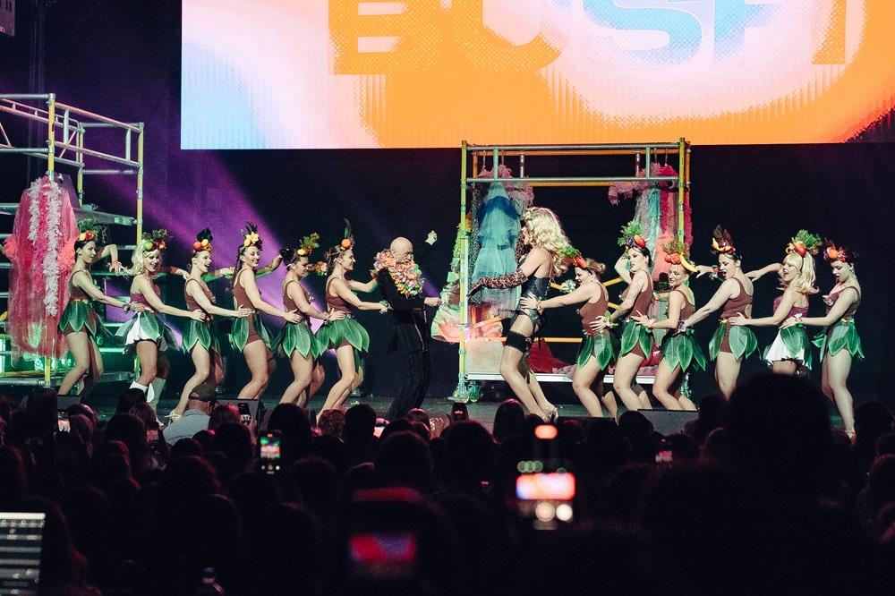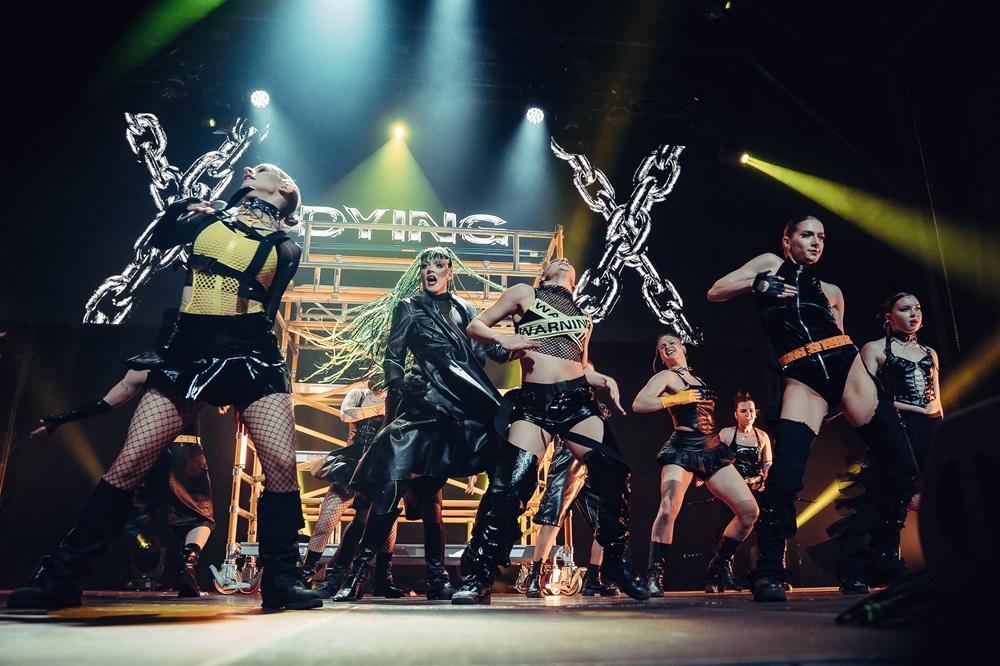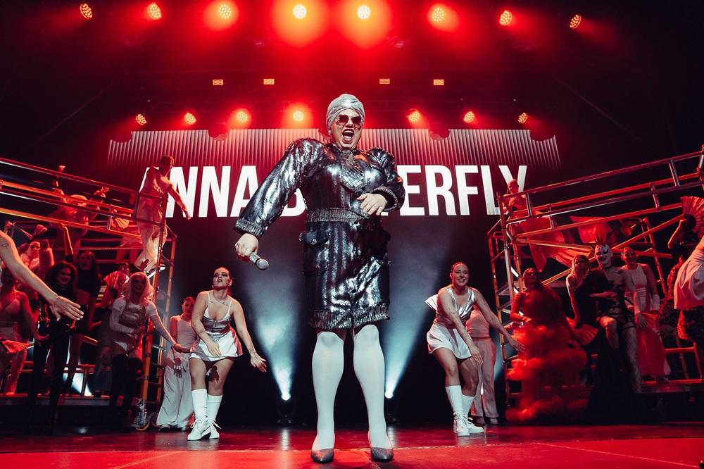 Uzvedumu veido vairāki secīgi "stāsti" – par sievietes vēlmi satikt savu īsto un vienīgo mīlestības objektu (šajā lomā lielisks Dzintars Krūmiņš), par sievietes cīņu ar atkarībām, par sievietes piedzīvoto vardarbību. Visu sižetu galvenā varone ir Pirmā Sieviete Latvijā, bet viņu pavada aptuveni 20 dejotāji, kuri stāstus izspēlē caur Roja izvēlētajām dziesmām (es cītīgi sažamēju katru dziesmu – Lady Gaga, Dua Lipa, Musique, RuPaul u.c.) un atbilstoši veidotu horeogrāfiju. Horeogrāfija ir tieša un paskaidro stāstā notiekošo – ja ir jautri un labi, dejotājas skaisti kustas mūzikas ritmā, ik pa brīdim un pie vajadzības tirinot persikus. Ja stāsta tēma ir smaga un sāpīga, parādās ķēdes, asinis un latekss. Man prieks, ka ne visas dejotājas ir vienādas miesasbūves – uz skatuves redzami visdažādākie ķermeņi. Lai Rojs paspētu pārģērbties kārtējam iznācienam, šovā iekļautas dažādas pārejas: aktrises Madaras Kalnas monologs, horeogrāfa Ivo Krieviņa un vairāku dejotāju vouginga [3] priekšnesums. Atgūties no grandiozā sākuma palīdz 15 minūšu starpbrīdis. Ar to pietiek, lai apskautos ar sen nesatiktajiem kvīru draugiem un aizrautīgi apspriestos.