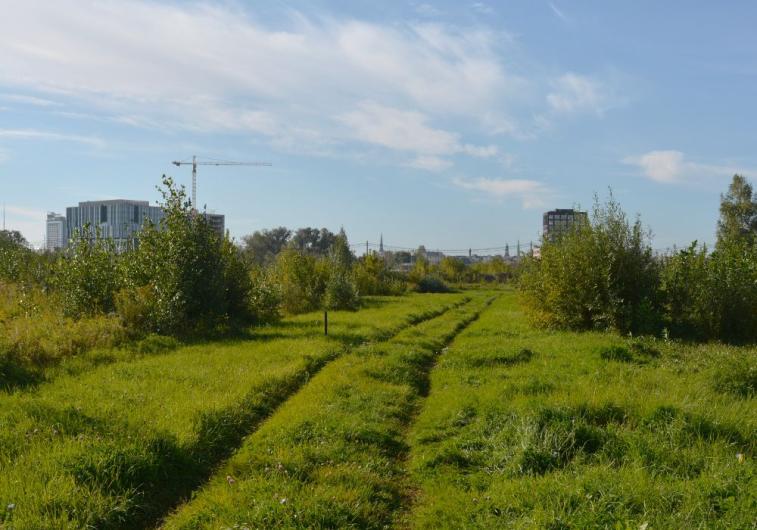 Puķes un ziedi, kas pārņēmuši divas paralēlās dzelzceļa sliežu līnijas, apstulbina ar savu košumu. Kādu gabaliņu ceļš turpinās taisni uz priekšu. Abos sānos žogi un brikšņi, centrā sliedes un neliela mājiņa dzelzceļnieku vajadzībām. Posms pakāpeniski sagriežas, veidojot nosacītu trīsstūri. Trīsstūra tālākās sānu malas veido Ganību dambja un Bukultu ielas krusts. Tur senāk bija pilsētas lopkautuve, kuras joprojām saskatāmo kantaino torni projektējis Rīgas pilsētas arhitekts Reinholds Šmēlings sadarbībā ar Rīgas galveno inženieri Ādolfu Agti [4]. Bet tas viss pāri ielai, žogiem, noliktavām, darbnīcām, volejbola hallei un pļavai, kas piepilda trīsstūri. Trīsstūra apakšējo malu jeb pamatni veido vairāki pamesti sliežu ceļi, gar kuriem ejam kopš šīs pastaigas sākuma. Patiesībā pašlaik sliežu rindas jau sagrieztas gabalos ar plazmas griešanas iekārtām. Nojaušams, ka teritorija tiek attīrīta būvniecībai. Agrāk necaurredzamās zāles, kas ietina sliedes un vietumis sniedzās līdz ceļiem, kontrastēja ar stikla torņiem, kas negausīgā ātrumā sacelti ielokā ap Skanstes, Hanzas, Sporta un Jāņa Dikmaņa ielām.