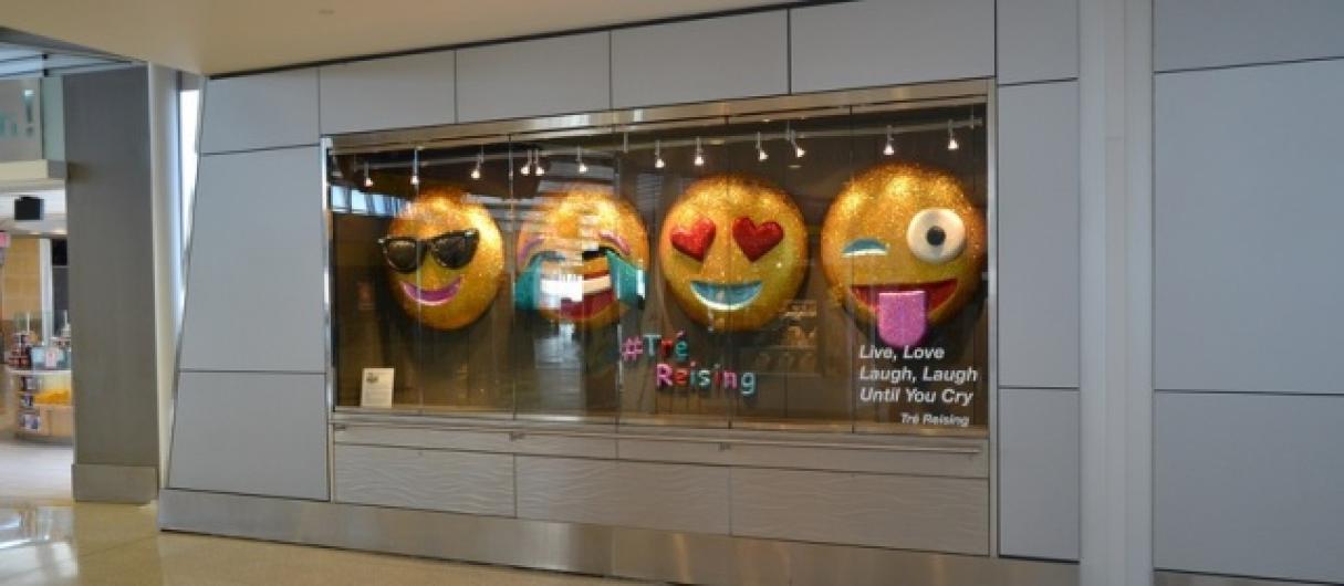 Kad Indianapolisā dzimušā, Bruklinā dzīvojošā mākslinieka Trē Raisinga darbs "#Belieb", kas bija izgatavots izstādīšanai Indianapolisas lidostā, tika noraidīts, Tre tā vietā radīja gigantiskus, mirdzošus 'emoji' atveidus ar nosaukumu "Dzīvo, mīli, smejies, smejies, līdz tu raudi", atzīstot: "ja vārdu ir par daudz, kā citādi māksliniekam sazināties?".