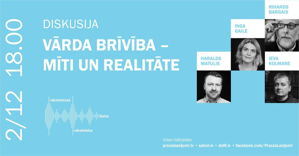 Trešdien, 2. decembrī, tiešsaistē notiks "Prozas lasījumu" diskusija "Vārda brīvība – mīti un realitāte". Aicinām no plkst. 18:00 skatīties diskusiju tiešraidē "Satori.lv".