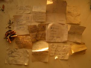 Dažādu izmēru, netīrības pakāpes, dažādās valodās tapuši. Rokām rakstīti, zemē nomesti iepirkumu saraksti. Atceros, kā pirmo pamanīju uz Mērsraga ielas savus trīs četrus gadus atpakaļ. "Cīsiņi, baltmaize, pelmeņi", kaut kas no tās sērijas. Skaists rokraksts.